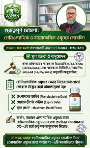 হোমিওপ্যাথিক ওষুধের ক্ষেত্রে উৎপাদনের তারিখ, মেয়াদোত্তীর্ণের তারিখ এবং মূল্য (MRP) উল্লেখ করা বাধ্যতামূলক নয়।