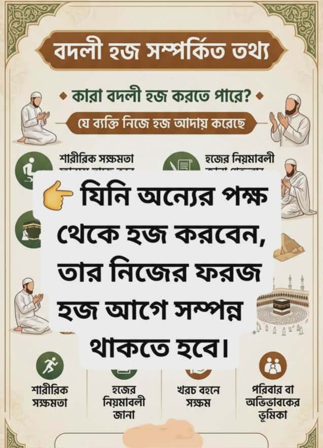 বদলী হজ (হজ্জে বদল) বলতে বোঝায়—কোন ব্যক্তি নিজে হজ করতে অক্ষম হলে তার পক্ষ থেকে অন্য কেউ হজ আদায় করা। কারা বদলী হজ করতে পারে? ১. যে ব্যক্তি নিজে হজ আদায় করেছে যিনি অন্যের পক্ষ থেকে হজ করবেন, তার নিজের ফরজ হজ আগে সম্পন্ন থাকতে হবে। হাদিস: এক ব্যক্তি বলল, “হে আল্লাহর রাসূল! আমি আমার […]
