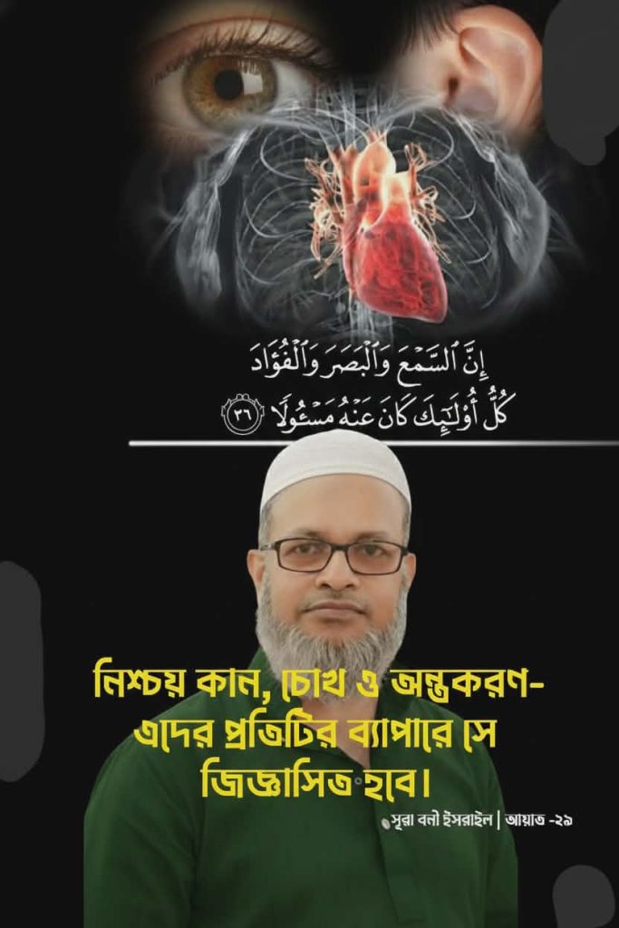 চোখ, কান এবং অন্তকরণ (ফুয়াদ/হৃদয়)—এই তিনটি অঙ্গকে জিজ্ঞাসাবাদ করা হবে।” আল্লাহর বাণী— إِنَّ السَّمْعَ وَالْبَصَرَ وَالْفُؤَادَ كُلُّ أُولَٰئِكَ كَانَ عَنْهُ مَسْؤُولًا “নিশ্চয়ই কান, চোখ ও অন্তকরণ—এগুলোর প্রত্যেকটি সম্পর্কে জিজ্ঞাসাবাদ করা হবে।” সূরা বনী ইসরাঈল (১৭): আয়াত ৩৬ ছবির মূল শিক্ষা আল্লাহ আমাদের ইন্দ্রিয়গুলো অমানত হিসেবে দিয়েছেন দুনিয়ায় আমরা যা দেখি, শুনি ও মনে ধারণ করি—সব […]