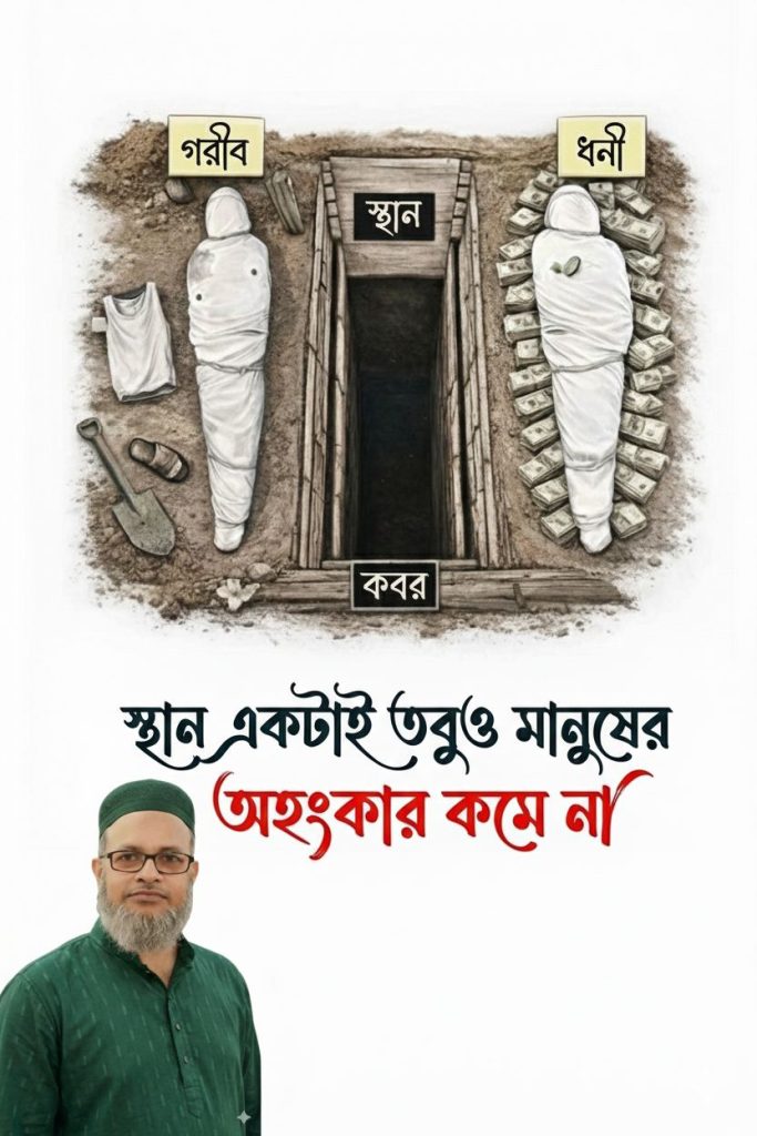 ধনী–গরিব উভয়ের কবর একই অহংকারের কোনো সুযোগ নেই বাস্তব সত্য দুনিয়াতে কেউ ধনী , কেউ গরিব — কিন্তু মৃত্যুর পর সবার কবর এক একই মাপ একই কাঠের তখত একই অন্ধকার কোরআনের আলোকে ১. অহংকারের পরিণাম “পৃথিবীতে দম্ভভরে চলাফেরা করো না। তুমি তো কখনো জমিনকে বিদীর্ণ করতে পারবে না এবং উচ্চতায় পাহাড়সমও হতে পারবে না।” সূরা […]