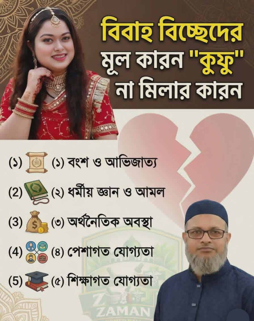 কুফু মিলিয়ে বিবাহ করুন! অনেক বিবাহ বিচ্ছেদের মূল কারণ—কুফু না মেলা কুফু (كَفُؤ) কী? অর্থ: সমতা, সমকক্ষ, সামঞ্জস্য ইসলামে—বর-কনের দ্বীন, চরিত্র, আর্থিক ও সামাজিক অবস্থায় মিল থাকা কেন কুফু জরুরি? ১. দ্বীনদারিতায় মিল একজন দ্বীনদার, অন্যজন বেদ্বীন হলে জীবনে দ্বন্দ্ব তৈরি হয় → অশান্তি ২. আর্থিক সামঞ্জস্য আয়-ব্যয়ের মধ্যে ভারসাম্য থাকা দরকার বড় পার্থক্য হলে […]
